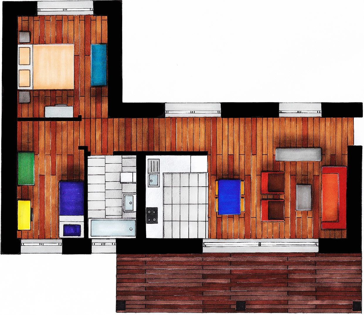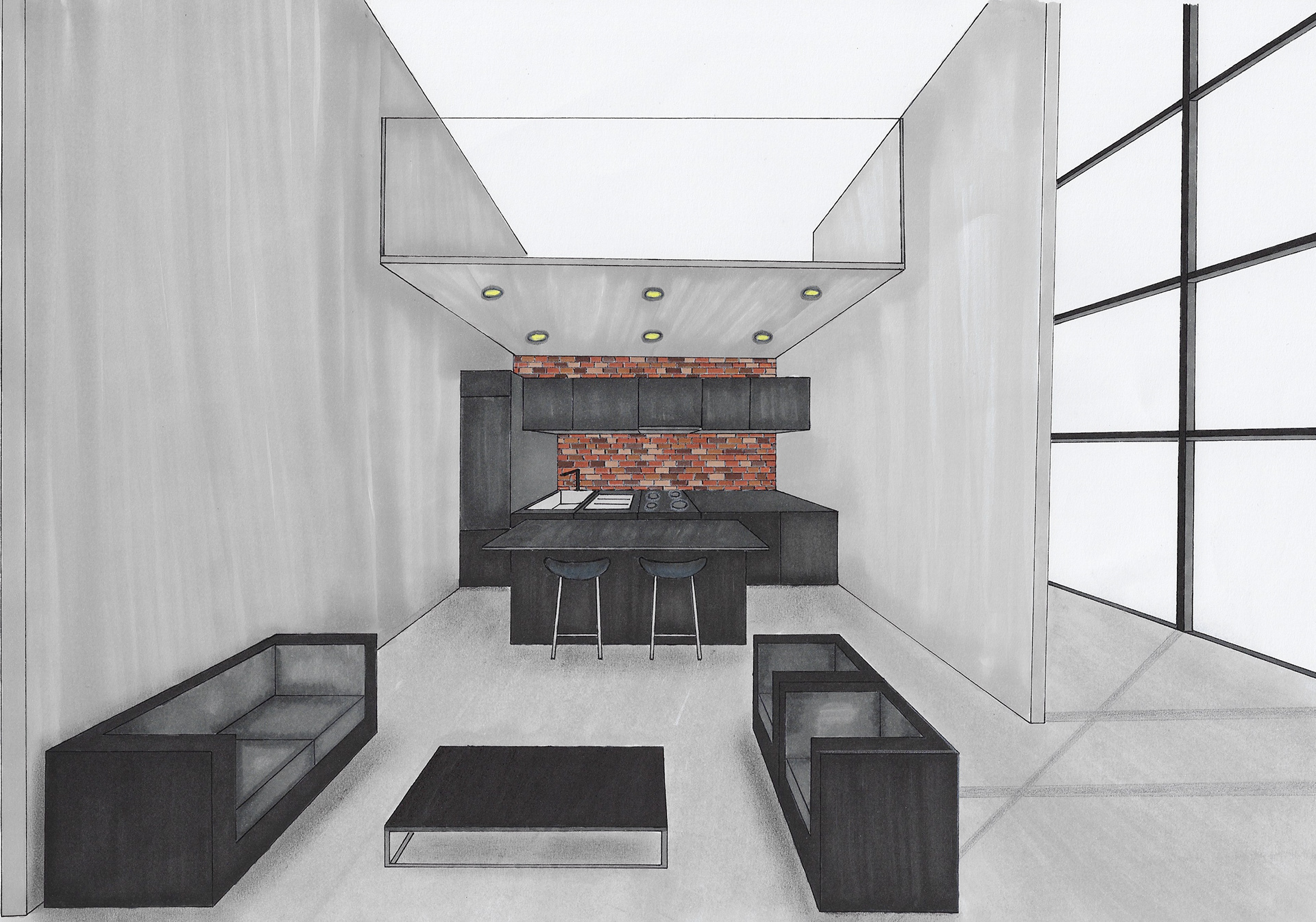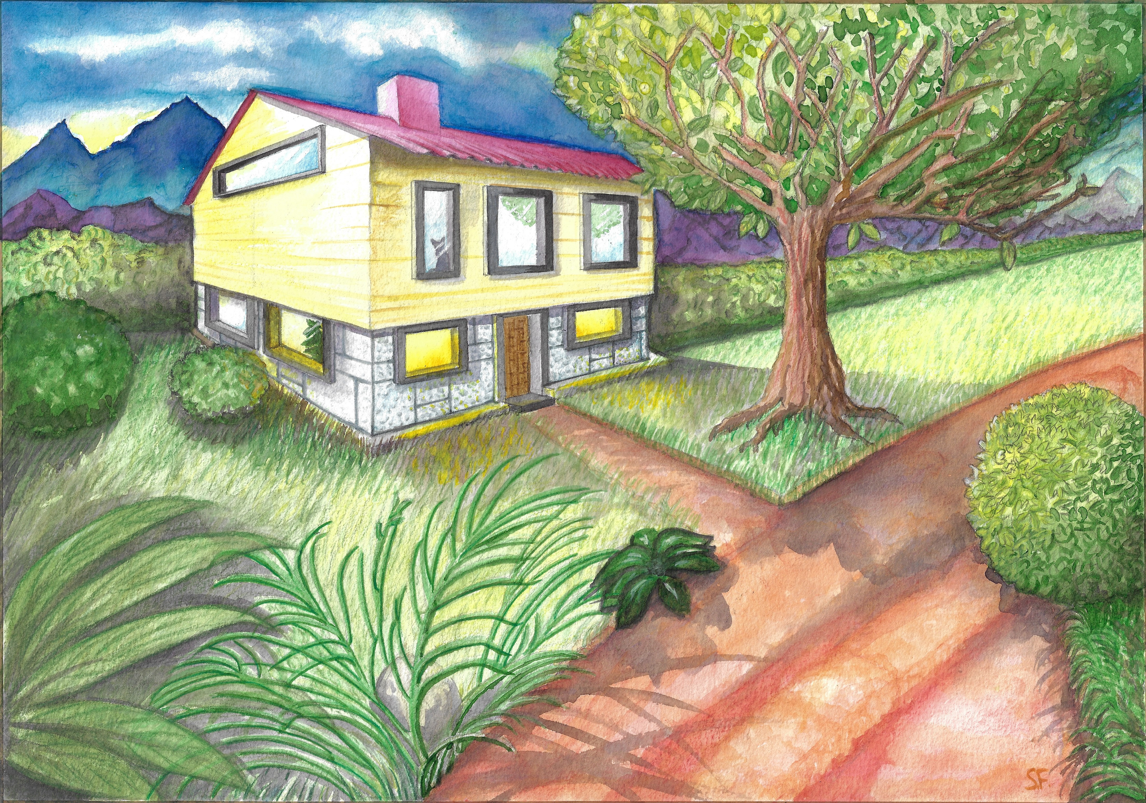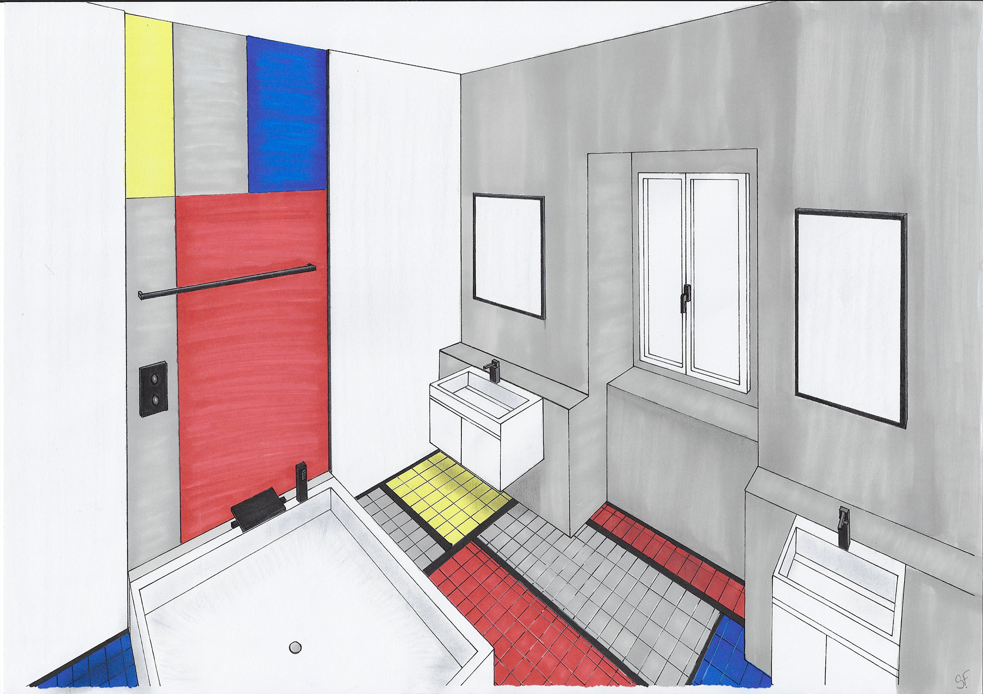 Perspective 1 et 2 points de fuite – Techniques mixtes : marqueurs, crayons, pastel, aquarelle