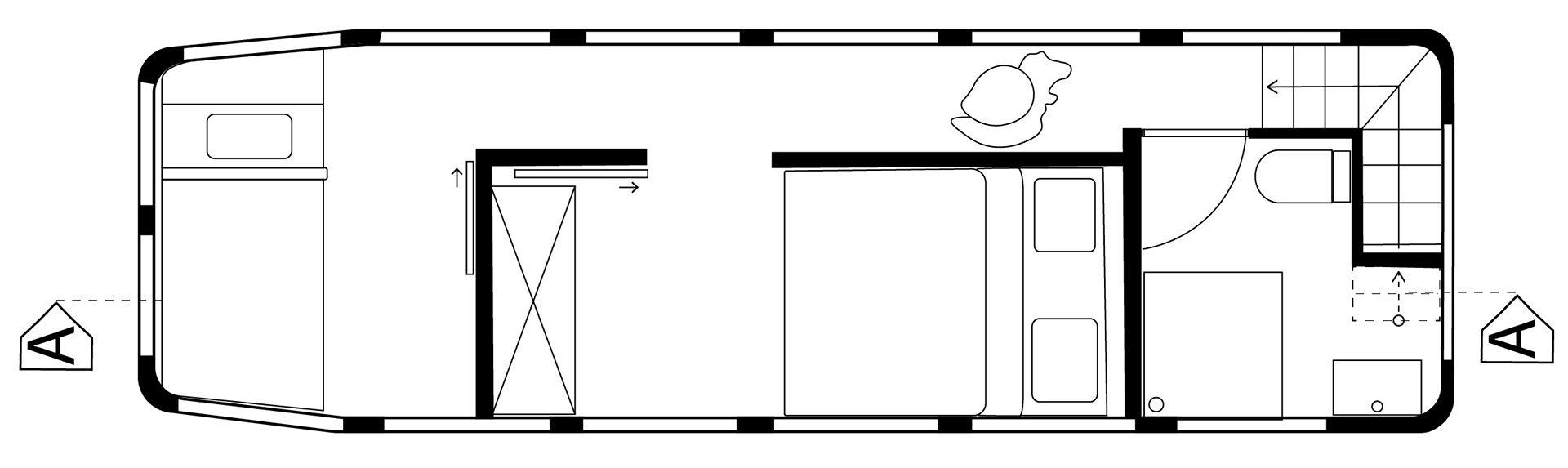 Le rez-de-chaussée accueille un salon et une cuisine ouverte avec du mobilier multifonctionnel pour s’adapter aux besoins changeants, tandis que l’étage supérieur comprend deux chambres et une salle de bains, offrant intimité et repos. Le bois naturel et le linoléum composent la palette intérieure, apportant chaleur et durabilité à ce foyer en mouvement constant.
